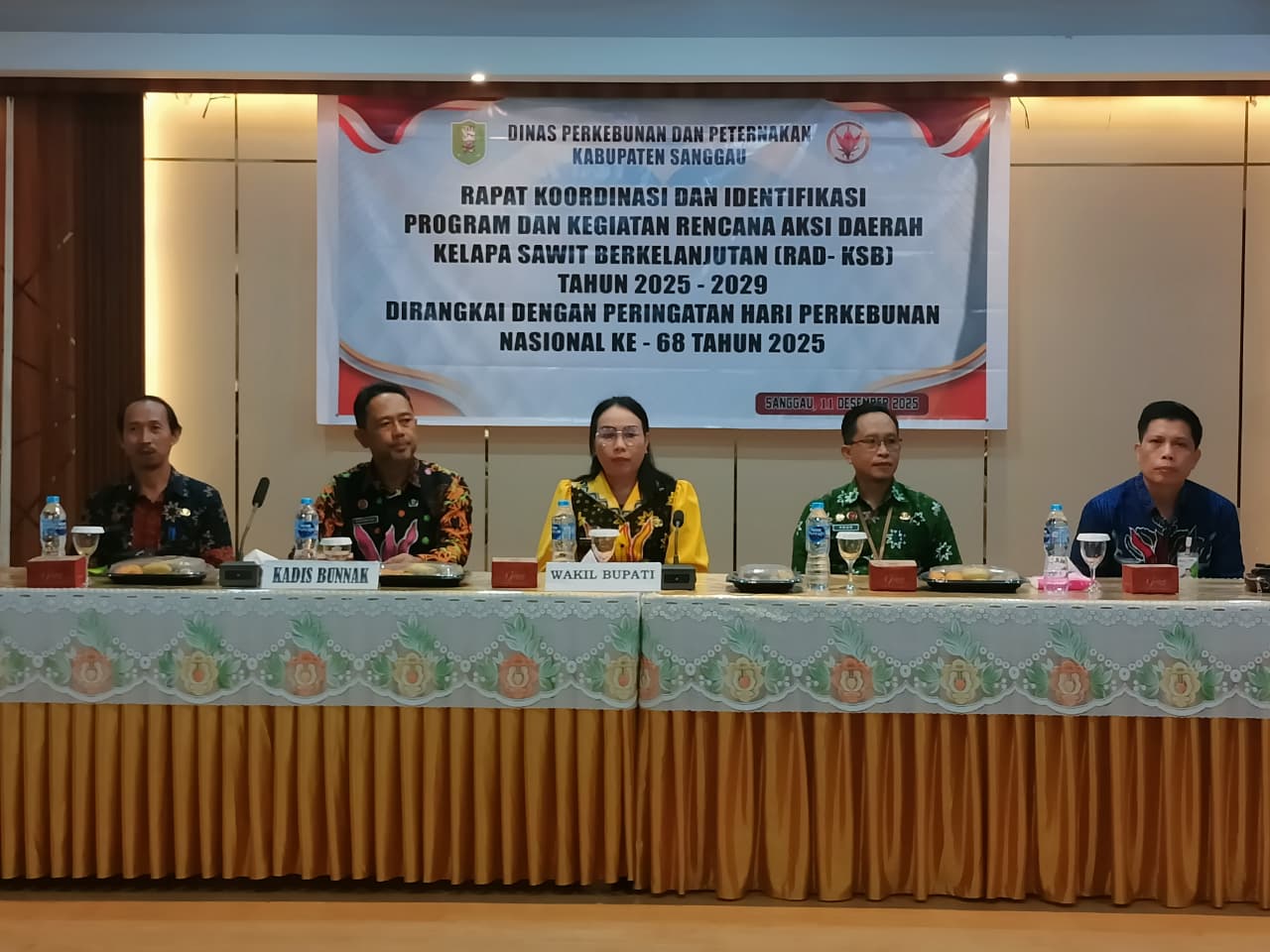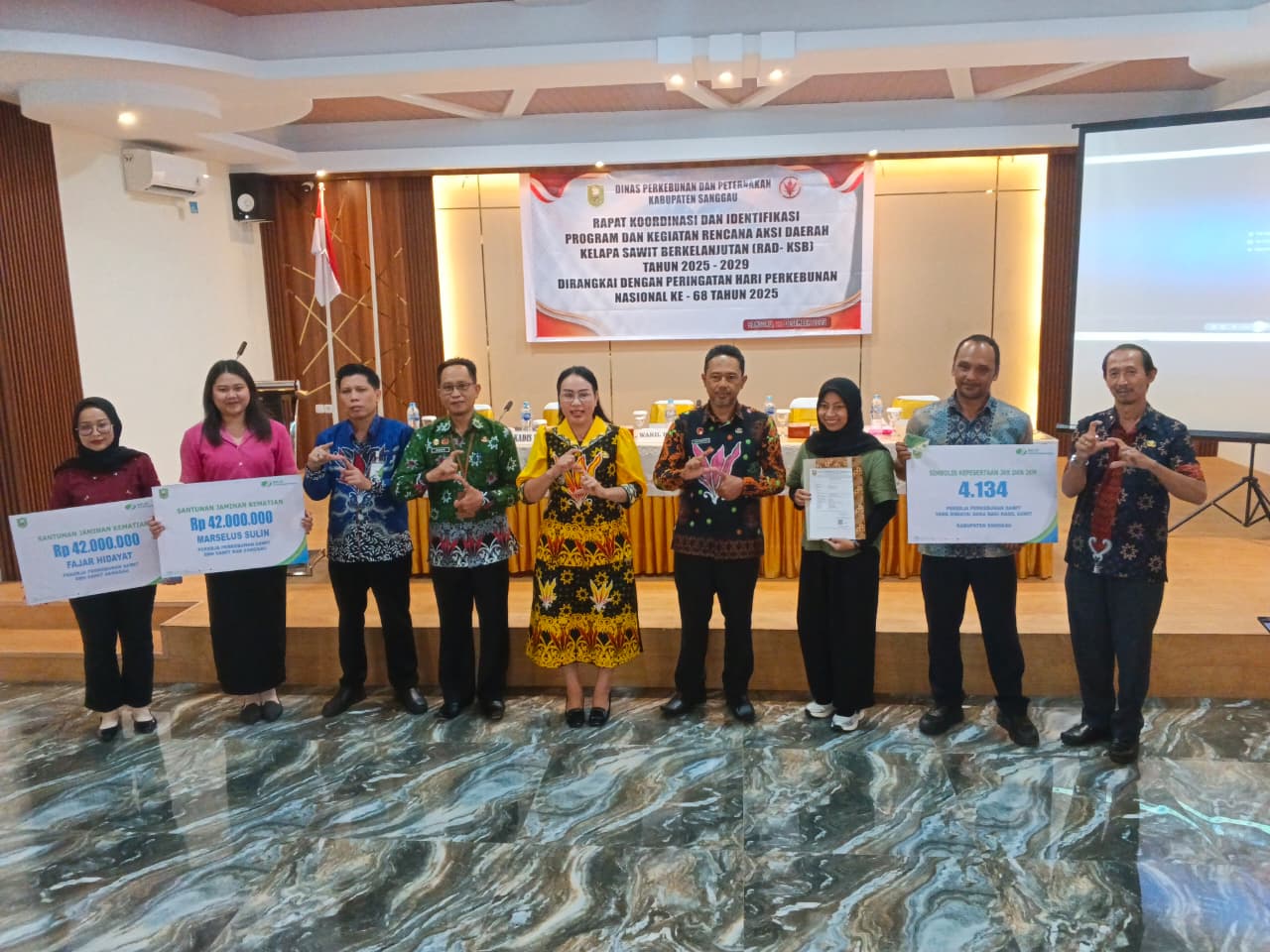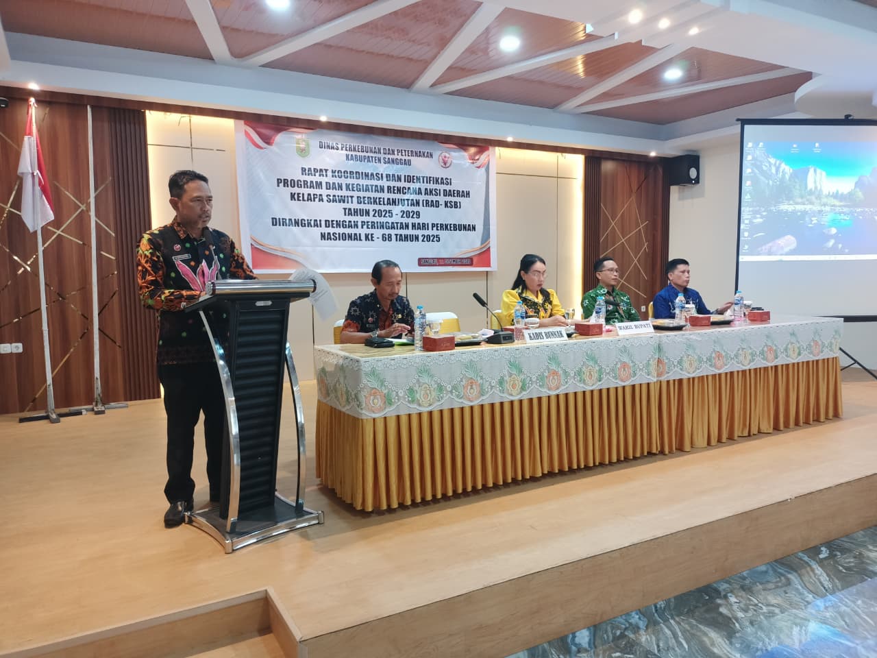 Pemerintah Kabupaten Sanggau menggelar Rapat Koordinasi dan Identifikasi Program dan Kegiatan Rencana Aksi Daerah Kelapa Sawit Berkelanjutan (RAD-KSB) Tahun 2025–2029, yang dihadiri oleh Wakil Bupati Sanggau, sejumlah Organisasi Perangkat Daerah (OPD), BPJS Ketenagakerjaan, serta perwakilan berbagai lembaga swadaya masyarakat. Kegiatan diawali dengan menyanyikan Lagu Indonesia Raya, Mars Sanggau, dan Mars Perkebunan, bertepatan dengan peringatan Hari Perkebunan Nasional ke-68.